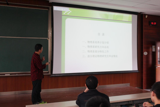 宣讲会伊始,吴兴刚教授为大家介绍物理专业的相关内容,主要对物理专业的导师概况、培养计划和研究方向做了详细介绍,条理清晰,为同学们疏通了思绪。吴教授的精彩介绍显示了物理学科所呈现良好态势,充分展示出了物理专业的内在潜力。此外,吴兴刚教授进一步细讲了我校物理系特色工作,为同学们徐徐展开物理的宏伟画卷。粒子物理方面,处于国际领先地位的双重味物理领域令人神往,“大国崛起”的展望更是振奋人心,此外,神秘的引力与天体物理、包罗万象的凝聚态物理、前沿的计算物理……无不牵动着同学们的好奇心。