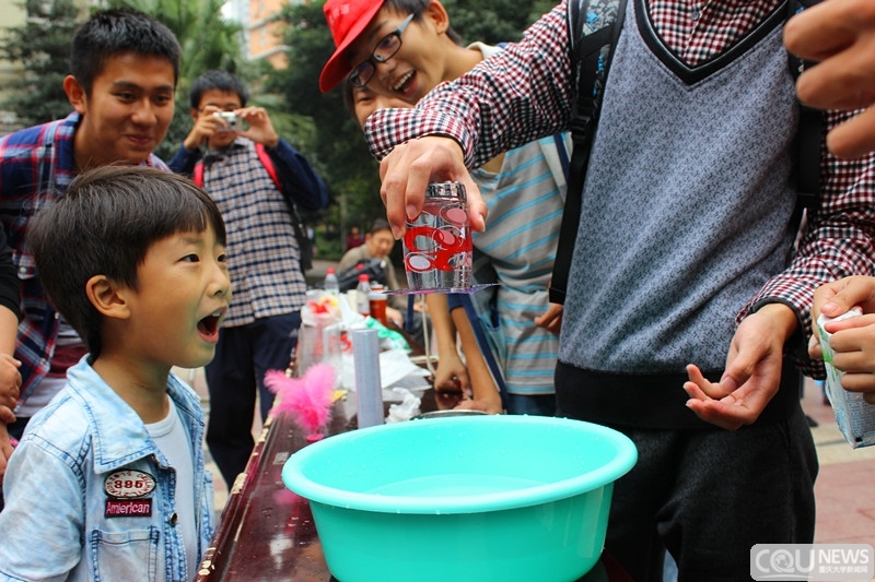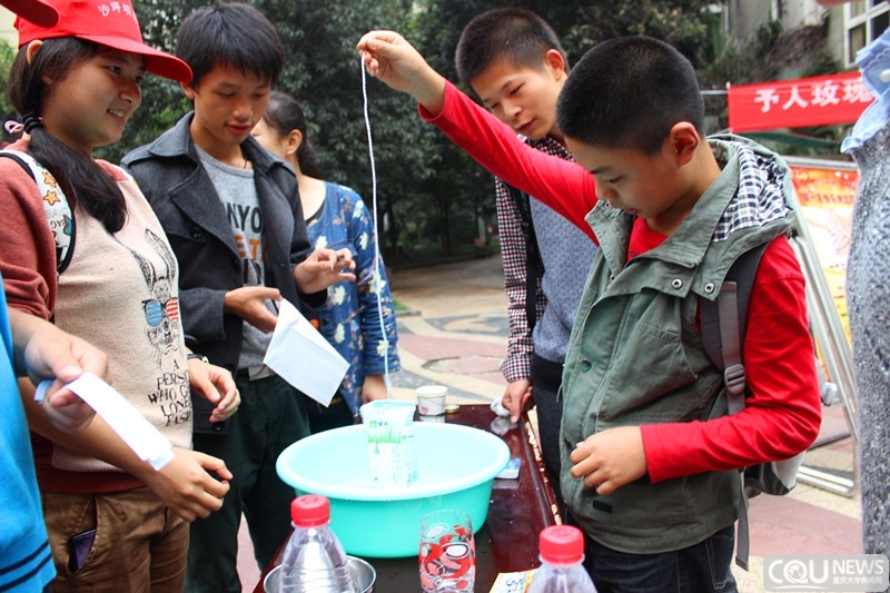 15名志愿者在到达目的地后立即开始布置活动中所需使用的桌椅、横幅以及展板等物件,志愿者的热情和努力,得到了饮水村社区工作人员的一致好评。一切准备就绪,4点许,志愿者迎来了他们期待已久的小客人们。不仅是小朋友,许多家长也围过来饶有兴趣的看着志愿者们做的科学实验。
