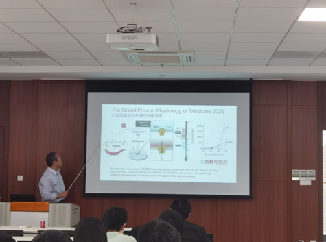 报告开场,戴吉岩教授以幽默风趣的话语向学生们讲述了21年诺贝尔生理学或医学奖的项目原理。进而讲述了老师自己的课题:智能材料。