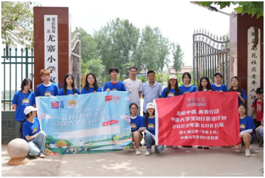 “青愿盈梦”实践团与董店乡南苑小学校长时振洪在校门前合影
