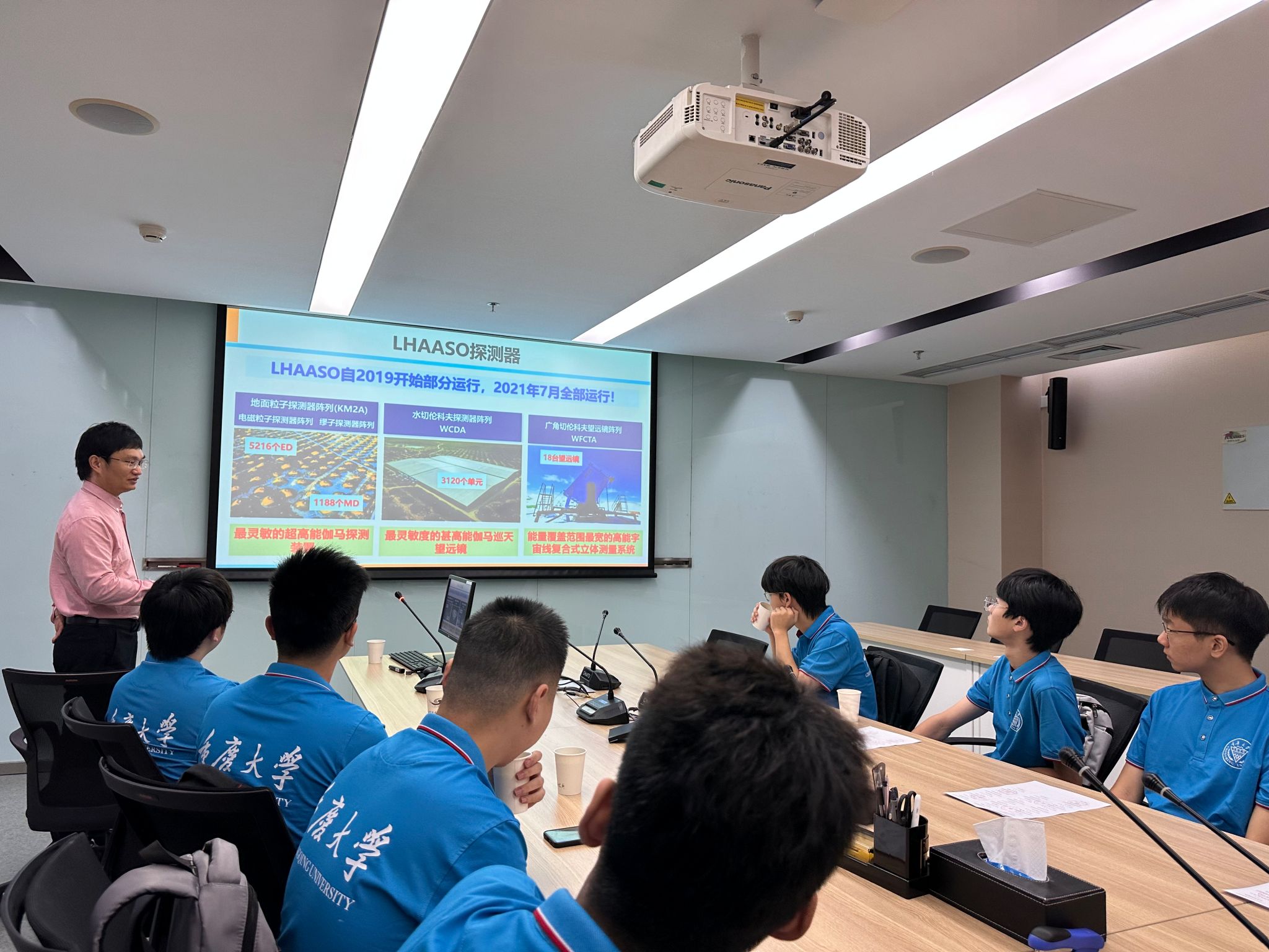 8月26日,实践团有幸听到了来自中科院高能所陈松战教授关于LHAASO实验的精彩报告。陈教授的讲解深入浅出,大家踊跃提问,与陈教授展开了热烈的讨论,一方面开阔了同学们的科研视野,另一方面点燃了他们对科学探究的热情,为后续几天的科研实习奠定了重要基础。