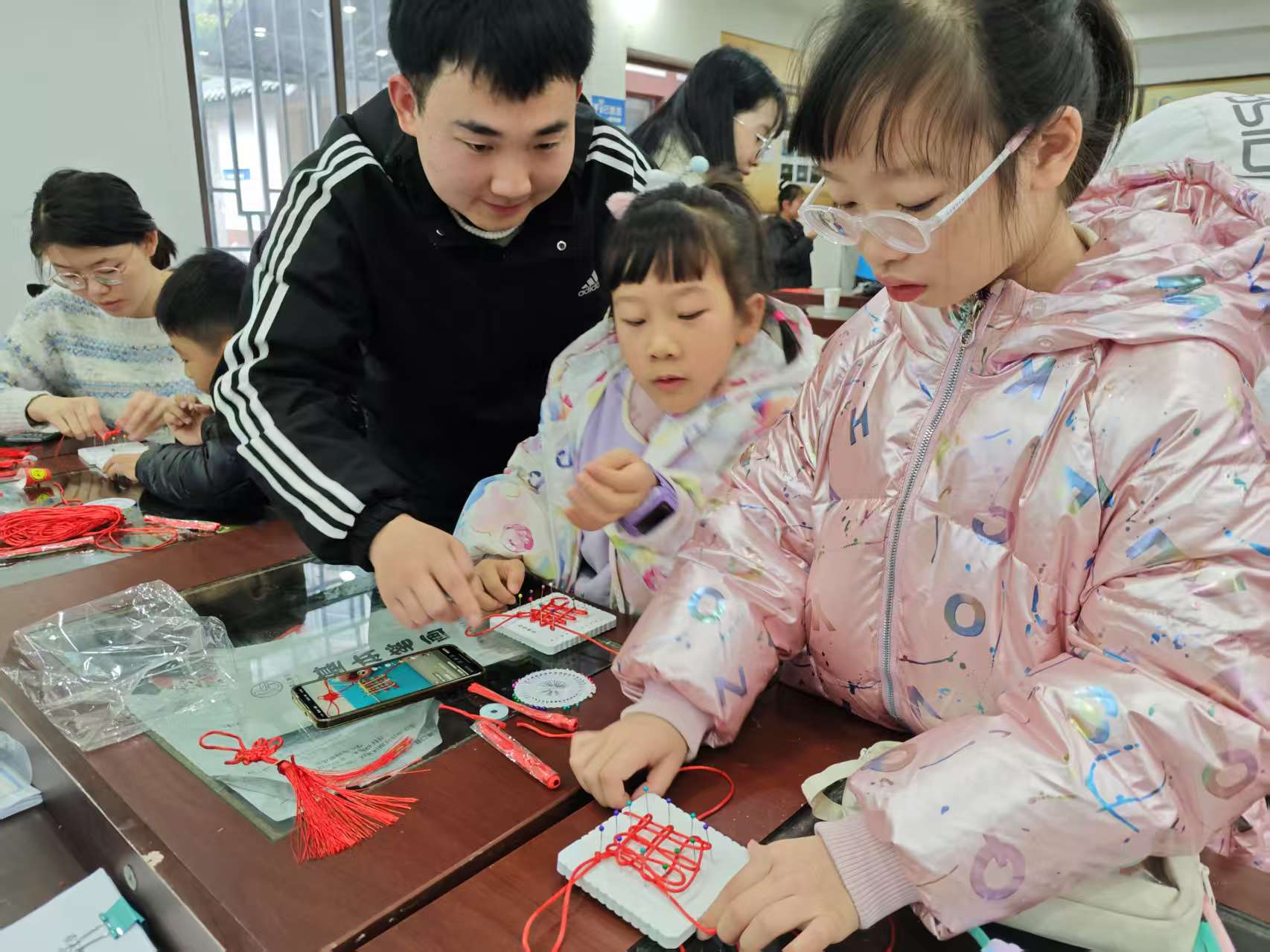 大家在实践团成员指导下,用丝线编织出一个个寓意吉祥的中国结,将五彩扭扭棒变成可爱动物和自由创意,挥舞手中的糖画笔绘制栩栩如生的图案,操控拓印体验年画技艺,一盏盏花灯在小朋友们手中逐渐成型,为节日增添浪漫氛围......孩子们玩得不亦乐乎。
