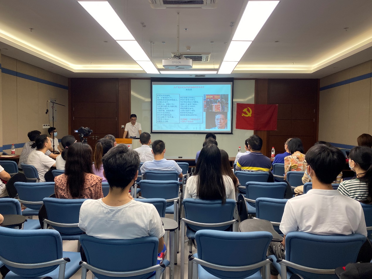 最后,韩忠同志讲述以“党旗在抗疫一线高高飘扬”为主题的党课。他讲到在新冠疫情期间,以习近平同志为核心的党中央高度重视,坚持全国一盘棋,让科学防治贯穿疫情防控全过程。他指出,在此次疫情中,各基层党员同志纷纷请战,一封封言辞恳切发自肺腑的请战书,这背后是每名共产党员用实际行动叩问初心、践行使命、身体力行的履行着党员的责任和担当。作为党员,在关键时刻,我们更应该迎难而上,不忘初心、牢记使命,积极发挥战斗堡垒作用和先锋模范作用。