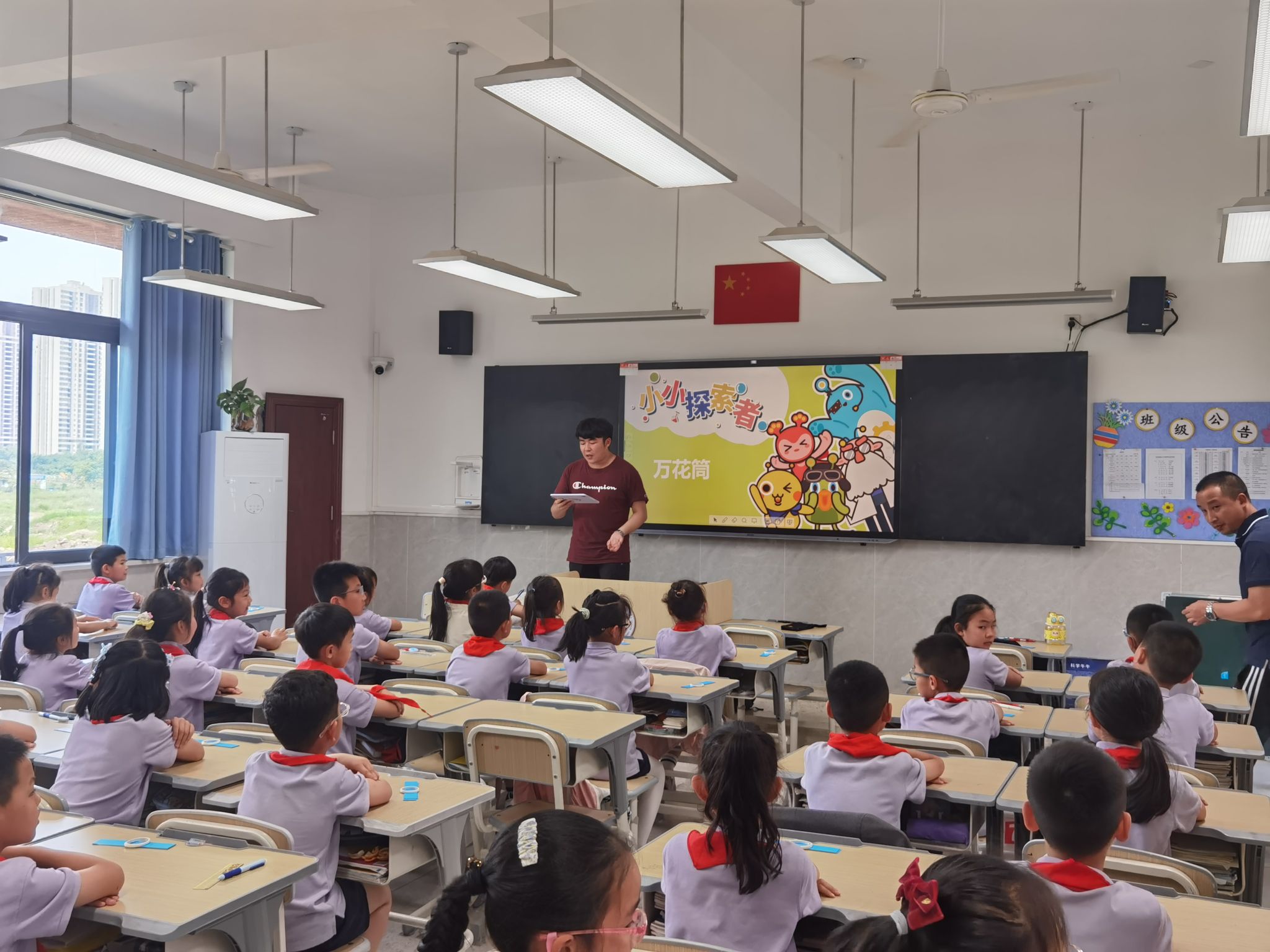 办公室教工支部书记魏娟带领支部全体党员同志,在三年级2班组织开展了“多彩万花筒,缤纷少年梦”DIY活动。首先,魏腾渊同志通过双语讲解了万花筒的来历、基本原理和制作步骤,让小朋友对万花筒中涉及到的光学知识有了初步的认识。然后,支部成员分组引导小朋友观赏万花筒成品,再让小朋友们充分发挥想象力,动手制作精美的万花筒。此次活动不仅培养了孩子们的动手能力,同时也点燃了他们对于科学的热情。