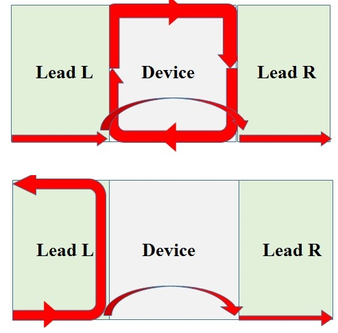上图:拓扑异质结中Fano共振时全透射和近全反射的电流分布