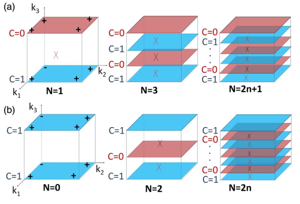 图1. 具有空间反演对称的磁性拓扑材料中Weyl点数目与时间反演不变动量点宇称、2D切割面陈数的关系。