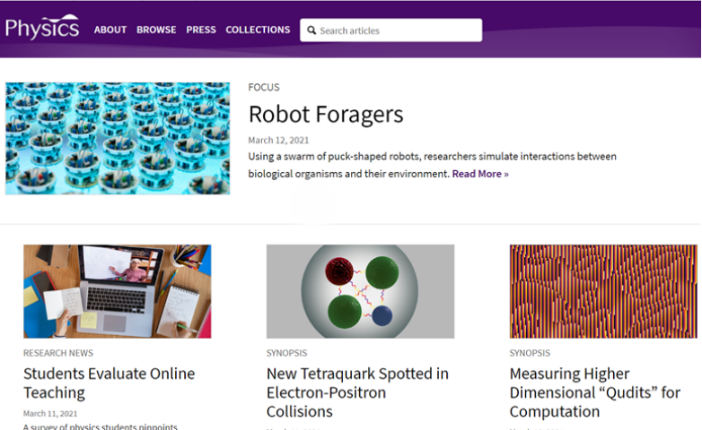 APS(美国物理学会)《物理》杂志在其官方网站黄色小视频置顶报道了该工作//physics.aps.org/articles/v14/38 并称赞这一新的研究可以帮助揭示生态系统中隐藏的复杂性和未探索的现象,为实验室中演示集群涌现行为提供了一条新的途径。该研究工具可以解决在实际场景中或计算机模拟中难以探索的问题,也可能会在许多受生物启发或其他因素影响的活性物质问题中被证明是非常有用的。