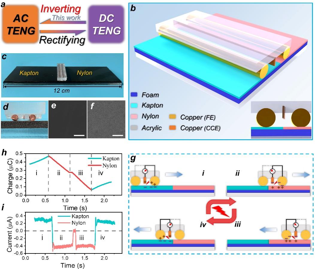 图示:(a)直流和交流输出模式转换示意图。(b)逆变式摩擦纳米发电机的三维结构示意图。(c)逆变发电机的实际器件图。(d)发电机的动子和定子的接触图,清晰可见电荷收集电极与摩擦表面具有间隙。(e)聚酰亚胺薄膜的扫描电镜图。(f)尼龙薄膜的扫描电镜图。(g)逆变发电机的工作原理图。(h)电荷输出曲线。(i)电流输出曲线。