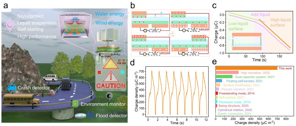 图1. a) LS-TENG收集风能为传感网络供电的愿景图;b) 固液起电和自激励;c) 电荷在液体中传输和耗散; d) 发电机的输出电荷密度;e) 与同类别器件的输出对比。