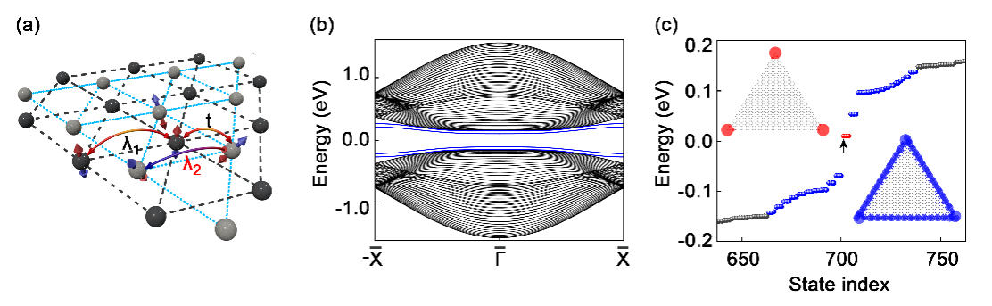 1:最小晶格模型预测。(a)双层三角晶格的耦合机制、(b)一维纳米带能带结构和(c)三角纳米盘的能量本征谱。