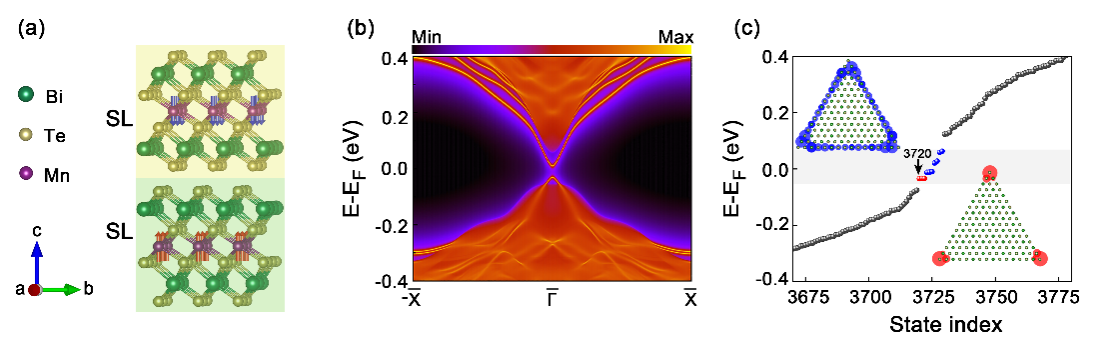 2:第一性原理计算材料候选。(a)双层 MnBi2Te4晶体和磁结构、(b)一维纳米带能带结构和(c)三角纳米盘的能量本征谱。