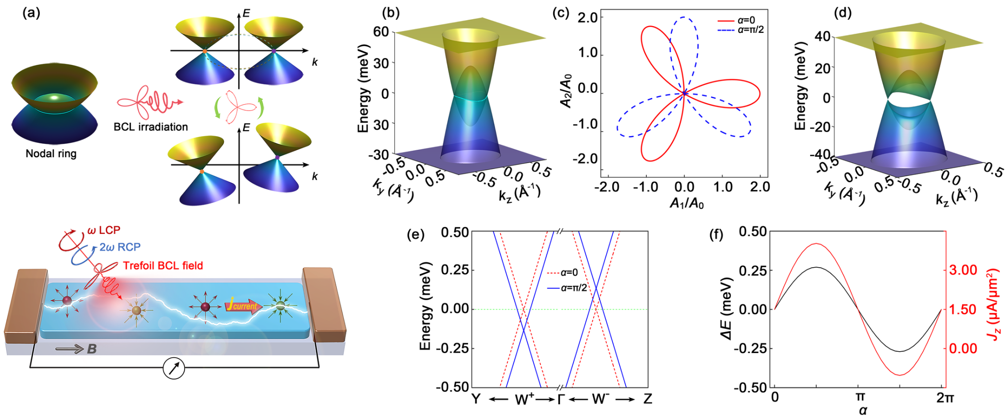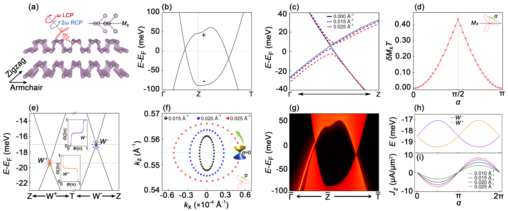图2.黑磷中双圆偏振光诱导的电子结构演化与可操控的回转电流。