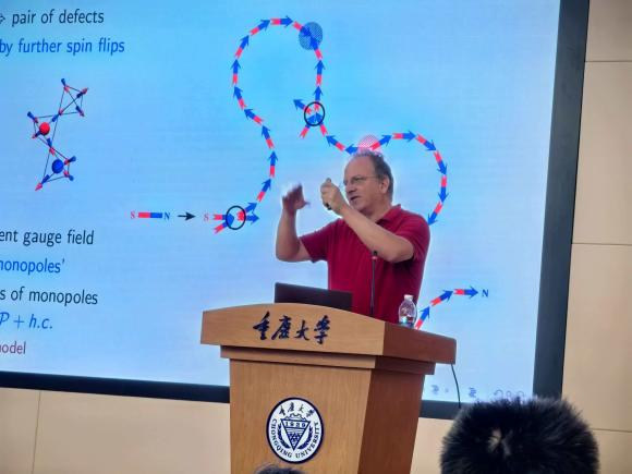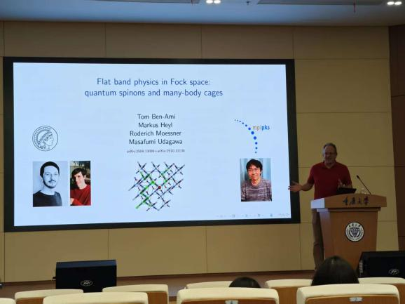 当日上午,来自德国马克思·普朗克复杂系统研究所的Roderich Moessner教授分享了他对Fock空间的平带物理的深刻见解:受阻挫限制的特定Fock态集合就像一个笼子一样困住了量子态,这种在Fock空间的局域化导致了平带的出现。Moessner教授带来的丰富物理图像激发了与会人员的极大兴趣,大家热烈讨论,获益匪浅。Roderich Moessner教授是世界著名的理论物理学家,在凝聚态物理多个领域作出了重要的贡献。他是现任德国马克斯·普朗克复杂系统物理研究所所长及马克斯·普朗克学会科学会员,其卓越成就荣获了包括欧洲物理学会奖(2012)和德国研究联合会莱布尼茨奖(2013)在内的多项国际顶级奖项。