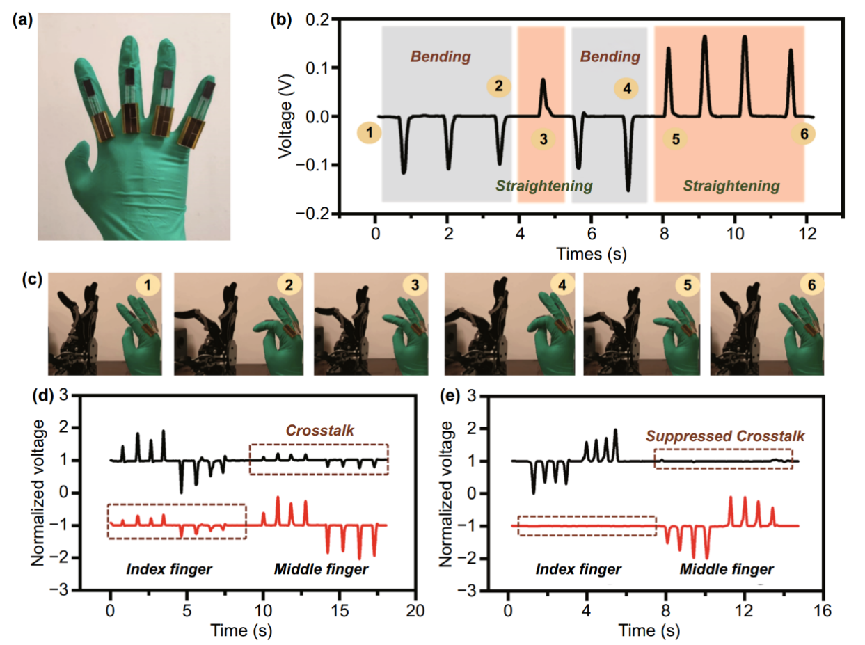 根据上述原理,以Ma-s-TS为基础,利用LabVIEW平台构建了一套人手-机械手同步动作系统来直观地控制机械手。图三(a)显示了戴在手指上的Ma-s-TS传感器。图三(b)和(C)分别是在手指完成“弯弯弯直弯弯直直直直”过程中,产生的正/负脉冲信号,以及机械手变化相位图。这表明了机器人手指的运动与人类手指的运动实时完全/完全同步,能够实时多方向连续控制。此外,Ma-s-TS在多通道控制中也显示出良好的稳定性。当某些手指弯曲时,其他手指通常会不自觉地被驱动。无意识的运动总是会产生错误的串扰信号。Ma-s-TS得益于磁力对滑块的限制,可以有效地抑制不同通道之间的串扰。在这里,Ma-s-TS通道之间的串扰(e)与先前的关节运动摩擦电量化传感器(d)进行了比较。Ma-s-TS更稳定,因此抑制了手指链接引起的串扰,这对于实现稳定的实时手势交互非常重要。