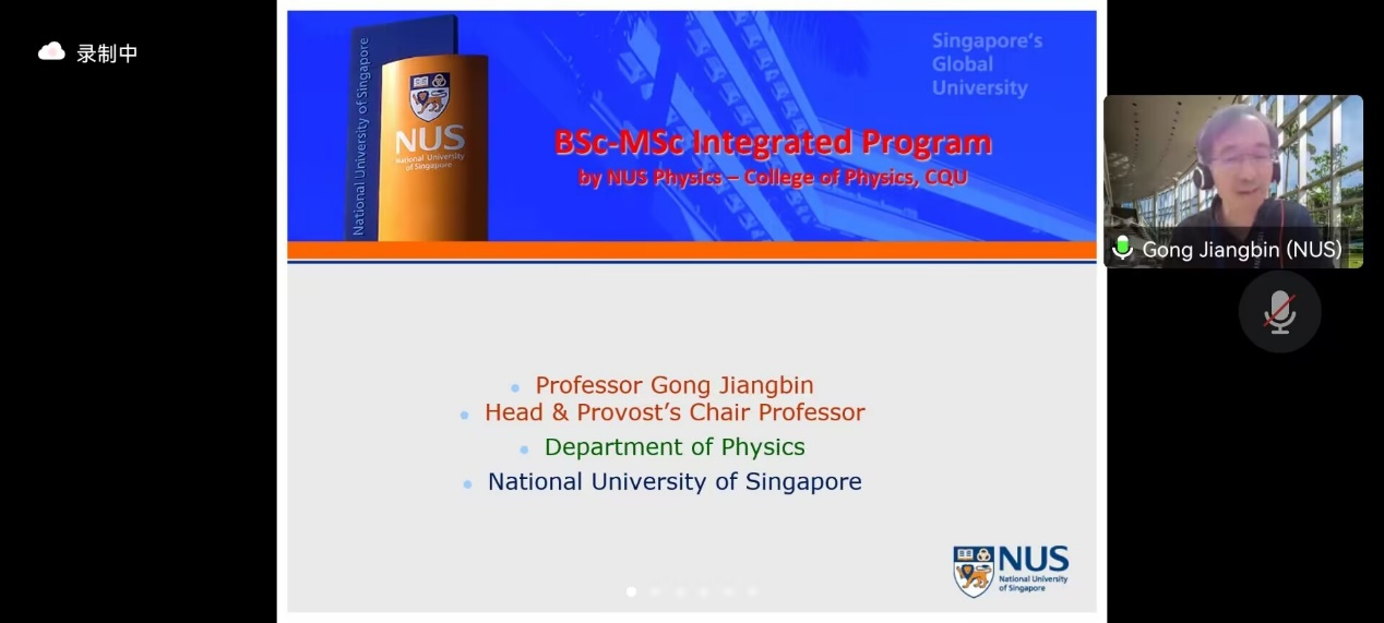 与新加坡国立大学(NUS)物理系本硕联合培养项目(3+2)说明会通过线上会议的形式举行,邀请到了新加坡国立大学物理系主任龚江滨以及副系主任王清海,为与会同学介绍项目细节并答疑解惑。黄色小视频